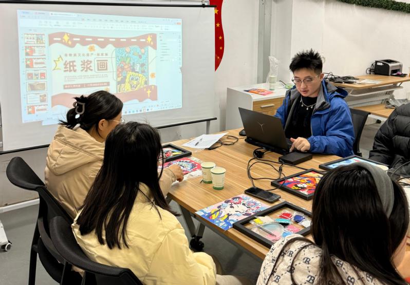 活动开场,工作人员向同学们分发材料包与工具,随后带教老师缪凯鑫开启体验课程。缪老师先介绍了纸浆画的非遗价值与环保意义,这项古老工艺以废纸为原料,加工成色彩斑斓的创作材料,契合当代青年绿色生活理念,蕴含“变废为宝”的智慧。接着,缪老师借助精心准备的课件,系统讲解纸浆画的历史渊源、制作流程与创作技巧。从纸浆选材、染色、塑形,到画面构图、填充、层次感营造,还针对卡通人物造型特点分享创作要点,如用圆润纸浆线条勾勒轮廓、通过色彩渐变表现面部神态,同学们听得专注,明确了创作方向。