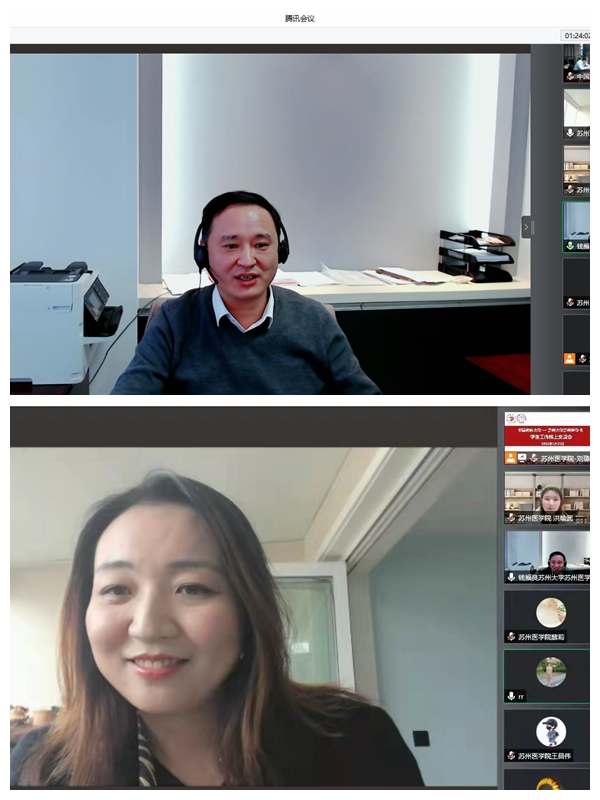 为进一步探讨医学教育管理的新模式,提高立德树人工作水平,促进优秀经验的交流与融合,3月25日,苏州大学苏州医学院与中国药科大学开展线上调研交流会。出席会议的有中国药科大学学工处处长杜文清、学工处副处长卢献锁、学生工作各部门负责人等一行,苏州大学苏州医学院党工委书记钱福良、党工委副书记副院长孟玲玲、学工办主任温洪波和有关同志参加了调研交流,就校园建设、办学总体情况、人才培养、医学人文教育相关工作开展情况等内容进行了深入交流探讨。
