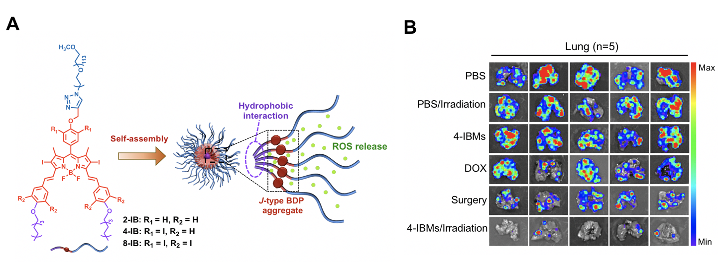 图2 多重碘原子修饰的BODIPY及由-、疏水相互作用介导形成的自组装纳米光敏剂结构图(A)及其抑制乳腺癌的复发与肺转移(B)