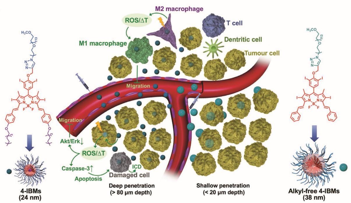 首先在光敏剂BODIPY母核结构上引入烷基链和PEG链,通过-和疏水相互作用诱导其自组装形成光敏剂胶束(~24nm,图2A)。该胶束具有显著的肿瘤靶向性、肿瘤深部渗透能力和胞内ROS转运效率。进一步通过多重碘原子优化光敏剂的光转换行为,提升其光动力、光热治疗的协同治疗指数,从而显著抑制乳腺癌的复发与转移,并降低光治疗的氧依赖性(图2B)。