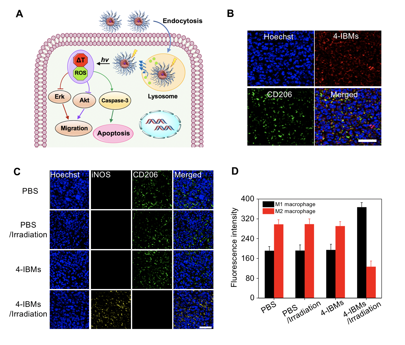 研究发现通过优化的四重碘修饰自组装光敏剂,能同时抑制多个肿瘤转移相关蛋白(如Erk、Akt等)的表达(图3),而单一光动力或光热治疗仅对其中一种转移相关蛋白产生抑制作用。同时,该光敏剂胶束还可高效产生免疫原性细胞死亡(ICD)效应,并重塑M2型肿瘤巨噬细胞为杀伤性的M1型细胞,从而协同抑制乳腺癌的复发和肺转移。