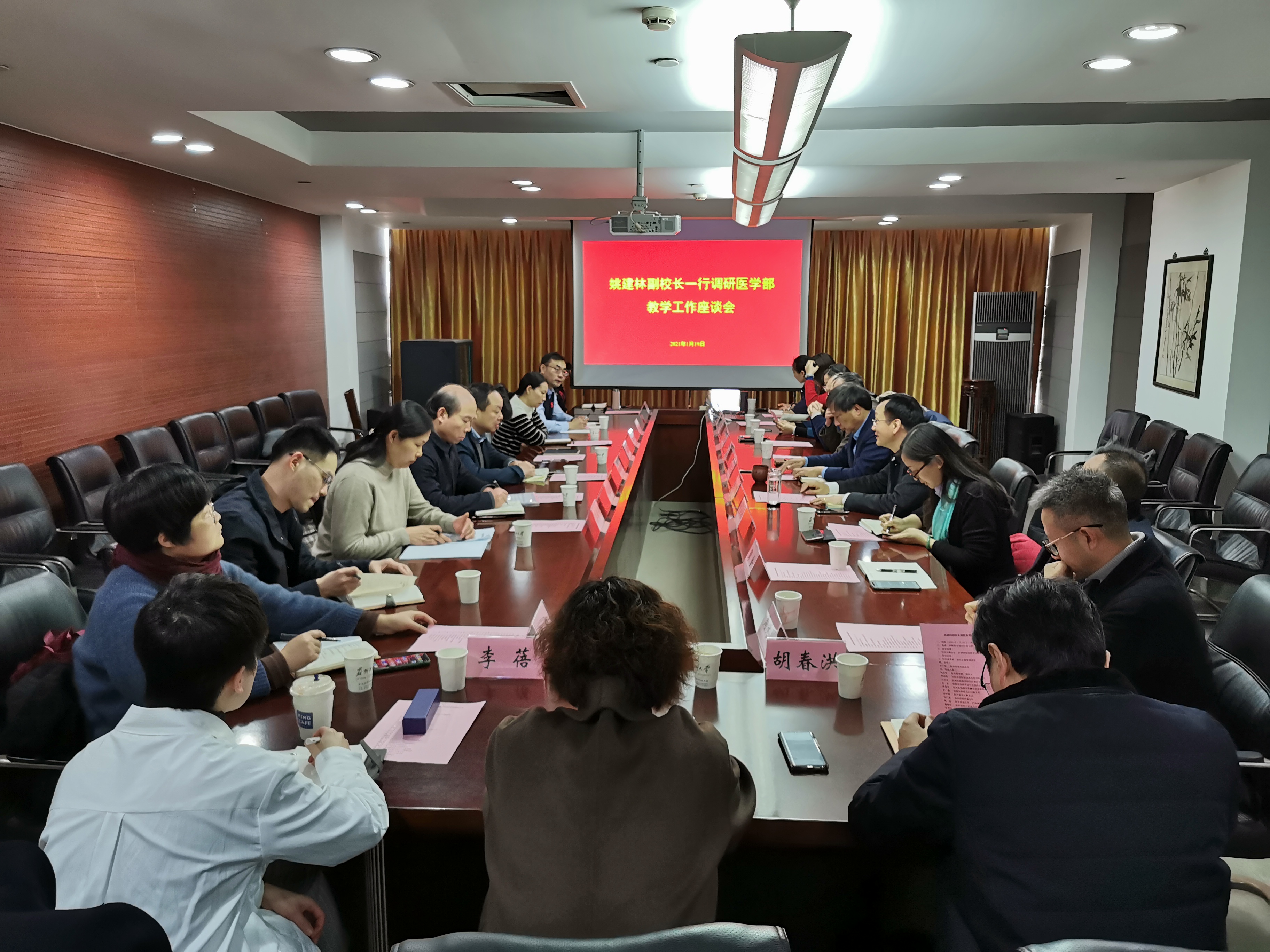 1月19日下午,校党委常委、副校长姚建林一行来医学部调研,在学部825会议室召开会议。校教务部教学改革与研究处处长茅海燕,校教务部教学运行处副处长刘方涛、陆丽,校教务部教学质量与资源管理处副处长常青伟,校教务部综合办公室主任李振陪同调研。学部党政领导班子、各学院和临床医学院主要领导以及相关职能部门领导和工作人员参加调研会,会议由医学部常务副主任徐广银主持。