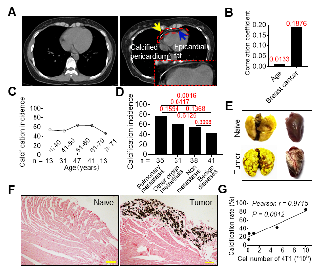 图1:乳腺癌患者和乳腺癌模型小鼠发生的心包钙化(图片源自PNAS)