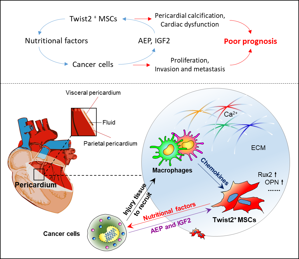 研究团队利用小鼠模型研究了乳腺癌相关心包钙化的机制。研究发现,心包钙化发生率与乳腺癌肺转移肿瘤负荷呈正相关,发生心包钙化的乳腺癌肺转移小鼠生存期明显缩短。小鼠心包钙化发生在胸壁侧的特定区域,该区域组织发生钙化时高水平表达炎症和成骨分化信号分子,利用Whole mount染色方法观察到心包钙化区域率先出现F4/80阳性巨噬细胞(macrophages)和Twist2阳性间充质干细胞(mesenchymal stem cells,MSCs)的富集分布,利用CSF1R中和抗体或氯磷酸盐脂质体清除巨噬细胞缓解心包钙化,静脉注射MSCs加速心包钙化。