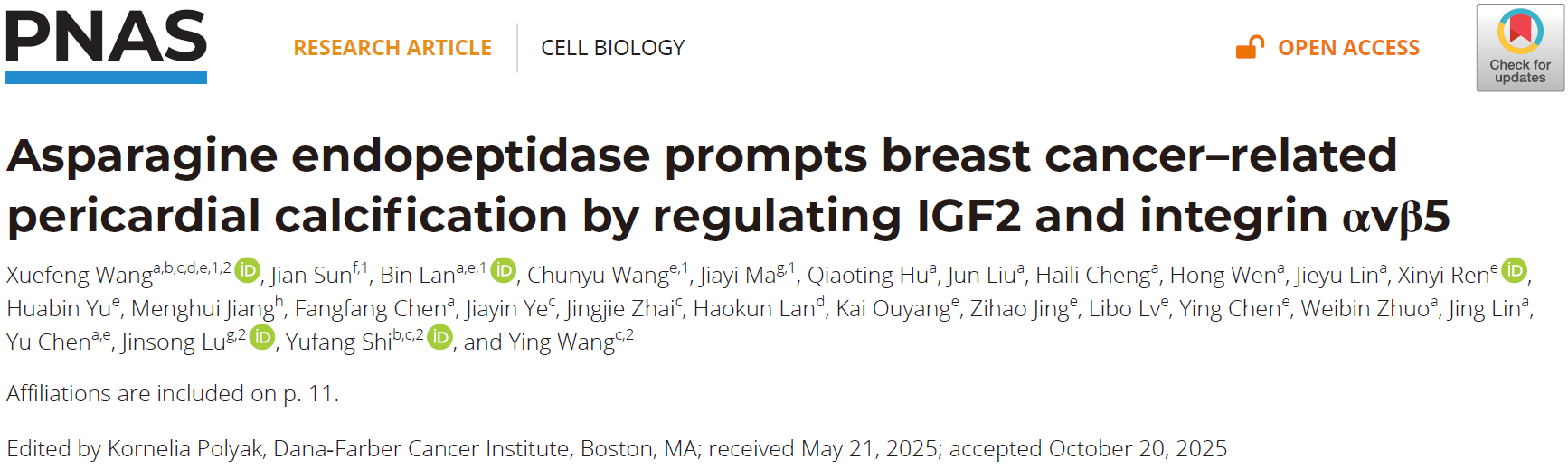 2025年12月4日,苏州大学转化医学研究院时玉舫教授研究团队联合中国科学院上海营养与健康所王莹研究员/上海交通大学仁济医院陆劲松主任/福建省肿瘤医院王雪枫研究员团队在PNAS正式发表题为“Asparagine Endopeptidase Prompts Breast Cancer-related Pericardial Calcification by Regulating IGF2 and Integrin αvβ5(天冬酰胺内肽酶调节IGF2和整合素αvβ5信号促进乳腺癌相关心包钙化)”的研究论文,揭示了心包钙化是加速乳腺癌进展及导致患者死亡的重要原因;阐明了乳腺癌驱动心包钙化发生、并形成促癌反馈循环的分子机制;提出定向管理组织损伤修复过程中免疫细胞与成体干细胞分化命运,有望改善乳腺癌患者心脏功能并延长生存期,为乳腺癌诊疗提供了新思路。