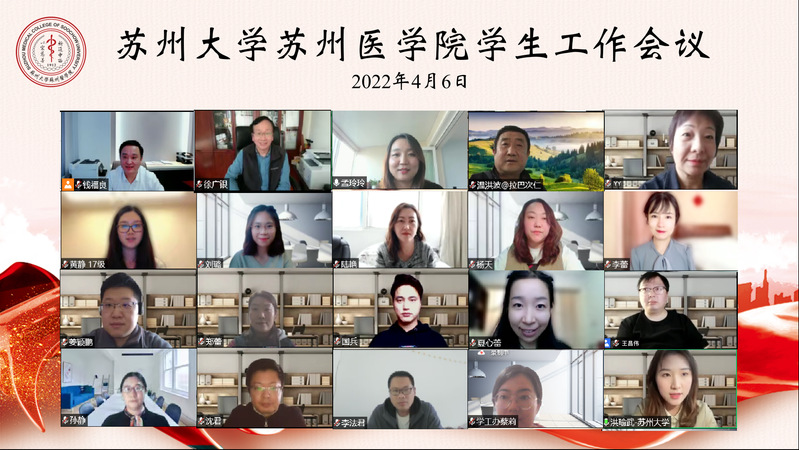 值此苏大医学教育110周年之际,恰逢国内抗疫的关键时节,为增强学生工作队伍的创造力、凝聚力和战斗力,加强思想引领,促进能力提升。 4月6日下午,苏州医学院组织召开了学生工作研讨会。我院党工委书记钱福良、常务副院长徐广银、党工委副书记副院长孟玲玲、学工办主任温洪波出席,学生工作办公室全体老师参会。本次会议由党工委副书记副院长孟玲玲主持。
