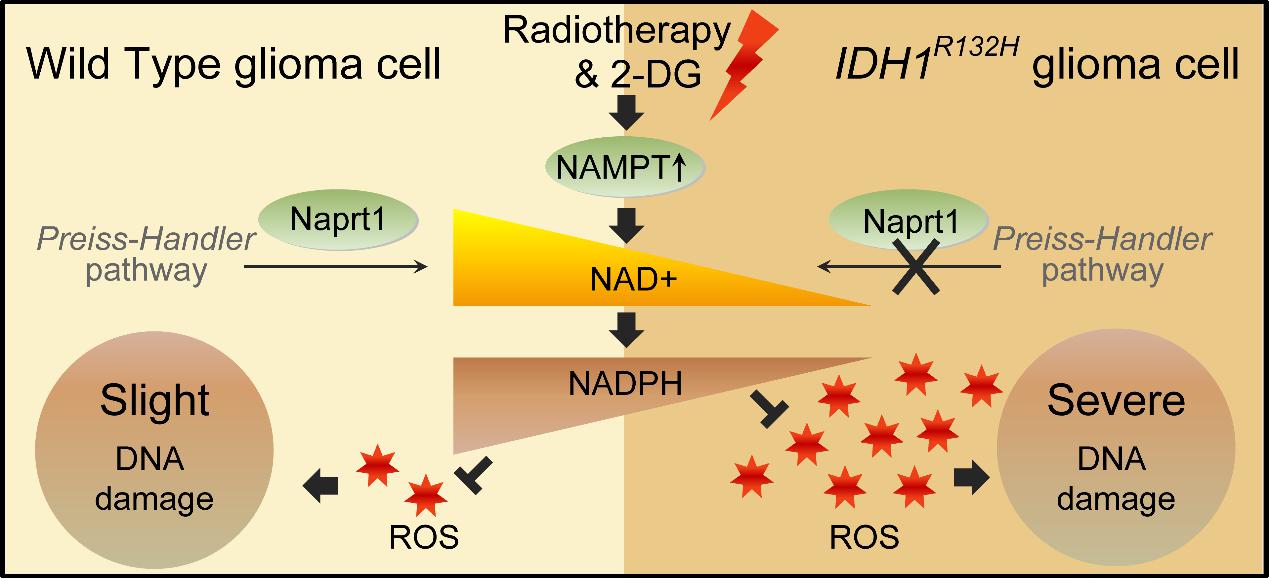 此外,WHOII、III级胶质瘤患者常存在异柠檬酸脱氢酶1(IDH1)突变,而具有IDH1突变的胶质瘤细胞常常存在NAD+合成缺陷,研究团队利用U87-IDH1R132H突变胶质瘤细胞株,发现2-DG对IDH1突变胶质瘤细胞具有显著的放射增敏效果。研究团队的结果表明胶质瘤细胞NAD+代谢缺陷可作为2-DG等糖代谢治疗的新靶点,而2-DG联合NAMPT抑制在提高胶质瘤放疗疗效方面具有很大的前景,有望成为胶质瘤患者新的曙光!