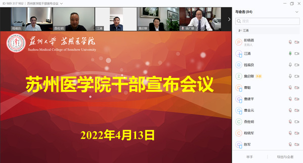 4月13日上午,苏州大学苏州医学院干部宣布会议在线上召开。校党委书记江涌,校党委组织部副部长(主持工作)查佐明,王志新院士,时玉舫院士出席会议。医学院院长詹启敏院士,医学院其他领导班子成员,内设各办公室(中心)主任,所属各学院领导班子成员,各科研院所负责人,医学院学术委员会和教代会部分代表参加了本次会议。会议由医学院党工委书记钱福良主持。