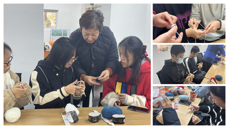 活动过程中,带教老师向同学们分发色彩斑斓的毛线、钩针等工具并耐心地教大家如何使用。带教老师从最基本的编织技巧开始手把手教学,如何持针、如何绕线、如何编织出均匀的网格等。在带教老师认真地指导下,学生们从生疏到了解再到熟悉掌握编织的基本技巧,从疏密不齐的网格到整齐的针脚,他们编织出了一个个专属于自己的作品。活动室充满了欢声笑语,传承优秀传统技艺文化的种子悄悄地扎根在每位同学的心中。