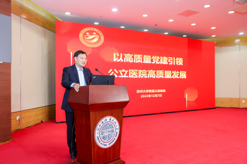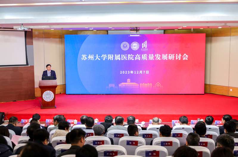 时值仲冬,枫红胜火,风景如画。为深入探索医学发展之路,推进苏州医学院与附属医院统筹一体发展,进一步推动苏州大学附属医院高质量发展,2023年12月7日下午,苏州大学苏州医学院在独墅湖校区炳麟图书馆学术报告厅举办苏州大学附属医院高质量发展研讨会。复旦大学附属华山医院院长毛颖教授,浙江大学医学院附属第二医院党委副书记、浙江大学医学院附属湖州医院(湖州市中心医院)院长马岳峰教授,苏州医学院领导班子,苏州医学院下辖各学院、科研院所、附属医院主要领导,苏州医学院各办公室(中心)主任,苏州医学院下辖各学院、科研院所、附属医院职能部门负责人和科主任代表出席研讨会。会议由苏州医学院执行院长徐广银主持。
