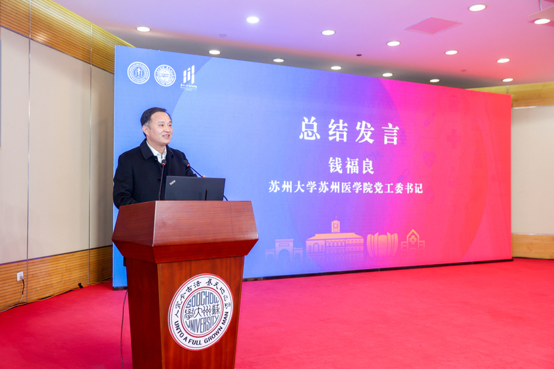 苏州医学院党工委书记钱福良作研讨会总结发言。他表示,今日研讨会中听到了许多关于医院高质量发展的真知灼见,兄弟医院也分享了实践发展上的宝贵经验,这些都为苏州医学院和附属医院的工作指明了方向,提供了新的思路和动力。钱福良指出, 13所附属医院作为苏南地区的重要医疗力量,承担着重要的医疗任务和社会责任,要坚持“名院名师名医”战略,不断深化人才培养、学科建设、科学研究、医教研协同、合作交流。苏州医学院也将做好对附属医院工作的支撑,努力为附属医院争取更多的资源、权益,帮助附属医院搭建学科发展和科研创新平台。同时也期待各附属医院不断提升医疗技术、创新管理模式,注重医学人才的引进与培养,加强学科建设和科研创新,助力各附属医院高质量发展再上新台阶。希望各附属医院和苏州医学院齐心协力,为推进苏州医学院进入国家医学院校第一方阵而努力,为人民健康事业作出更大的贡献。
