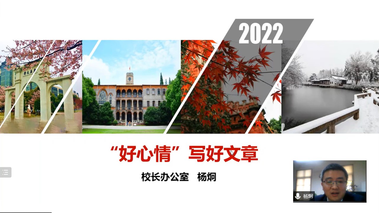 为进一步提升医学院党政管理人员的综合素能,提高服务效率,打造一支勇于担当、开拓创新、优质高效的党政管理干部队伍,4月22日下午,医学院党政管理人员素养提升系列专题讲座在线开讲,邀请校长办公室副主任杨炯做第一讲。