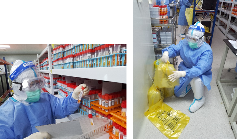 赵环作为总协调助理,每日工作最晚出舱,负责录入信息,分配样本,转运试剂,查找疑似阳性需复查的样本,提取后的试剂盒贴膜,妥善处理已检测完的样本;打包海量垃圾,传递出舱灭菌处理等。同为总协调助理的杨秭莹在总协调不在的情况下,发挥党员先锋模范作用,迎难而上,主动请缨,提出兼负总协调职责,保证了当班工作按时完成。身为母亲,她们始终坚定地认为,“我们是妈妈,更是中共党员,越是紧急越要冲在前,才能为更多的孩子守好防护线” 。
