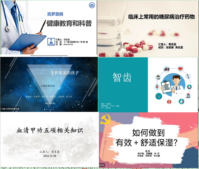 支部成员共分为6组,由卜一超、马云龙、巫浩东、刘一字、黄彧同志为大家进行了克罗恩病的相关知识科普,提醒大家不要对罕见的消化系统疾病掉以轻心;由黄名萱和徐嘉婕为大家科普了临床上常用的治疗糖尿病药物,让大家了解了糖尿病药物的分类和适用情况;章姝涵、杨梦菲、杨智怡、汤婕冉、张锦华、粟文秀这几位同志为大家进行了孤独症的相关知识科普,让大家更加深入地了解孤独症的临床表现和治疗;由吴雨欣、牛子贺、金怡卿和董进为大家进行了智齿相关知识科普,告诉大家小小智齿也要认真对待;齐志翔、葛家濠、潘林尧、府凯、陆子安同志则向大家介绍了血清甲功五项的相关知识,让大家粗略地读懂相关检查报告;舒铭锴、刘艺、陈子晗、范嘉慧、宋冰鑫、史雅娴进行保湿相关知识科普,教会大家如何让自己的皮肤保湿水润。