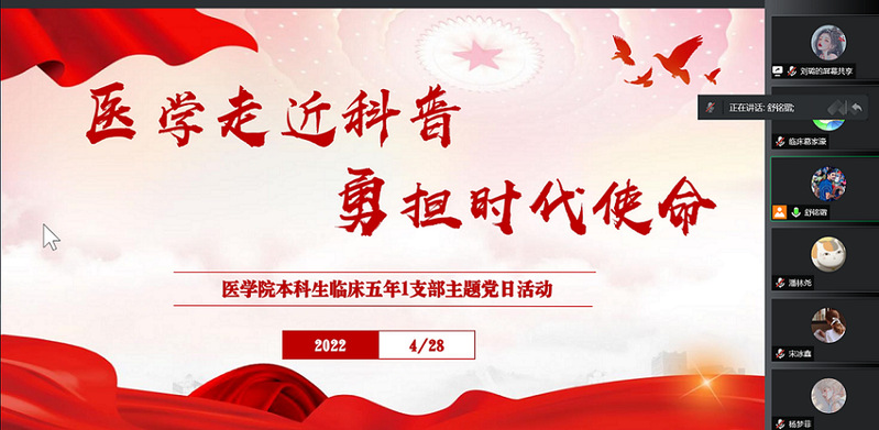 红医精神,即“红色医生精神”,源于中国革命战争年代,包括了政治坚定、对党忠诚的理想信念;救死扶伤,全心全意为人民健康服务的宗旨意识;埋头苦干、无私奉献的优良作风;技术优良、精益求精的工作作风。它们相辅相成,共同构成红医精神的本质内涵。为学习红医精神,践行新时代医学生使命,苏州大学苏州医学院本科生临床五年1支部全体党员于2022年4月28日举行“医学走近科普,勇担时代使命”主题党日活动,进行医学科普分享。