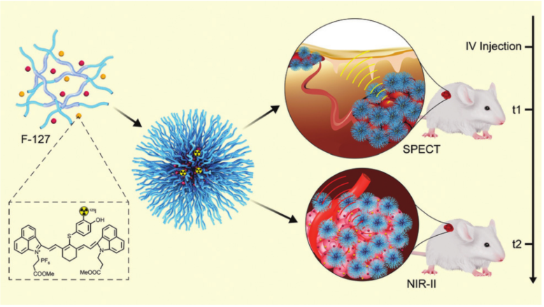 有效的肿瘤治疗在很大程度上依赖于准确的影像诊断和影像引导手术,为了提高手术的准确性,双模态和多模态成像成功应用于肿瘤诊断和影像引导手术。核医学成像和光学成像结合了高灵敏度和实时成像的优点,引起了人们的极大兴趣。然而,荧光染料和放射性核素的简单组合不能有效地靶向肿瘤部位,因此通常需要载体或靶向剂,例如多肽、抗体和纳米载体。然而,由于小分子染料的血液循环时间短,通常代谢快,这对于有效的肿瘤靶向和延长成像时间是不利的。抗体对某一种肿瘤具有很好的特异性,但对于肿瘤的诊断,特别是早期诊断,能够诊断多种肿瘤的探针是非常重要的。纳米载体可以通过增强和渗透滞留效应在肿瘤中蓄积,适合肿瘤诊断,特别是早期诊断。NIR-I染料发射的波长从650 nm到900 nm,穿透深度为几毫米,例如吲哚青绿(ICG),已经被食品和药物管理局(FDA)批准用于临床。与NIR-I荧光成像相比,NIR-II荧光成像(900-1700 nm)由于时空分辨率高,穿透深度深而引起了人们的极大关注。然而,到目前为止,已报道的SPECT/NIR双探针大多是放射性核素与NIR-I染料结合。因此,开发新型的放射性标记的NIR-II纳米探针对肿瘤成像和精确治疗意义重大。