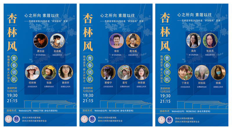 11月23日晚,苏州医学院2023年度“学生标兵”宣讲会通过Welink线上平台顺利开展。获评苏州医学院2023年度“学生标兵”的15名同学向2023级本科生分享了自己的所学所悟和所想所感。宣讲会由学生会组织。