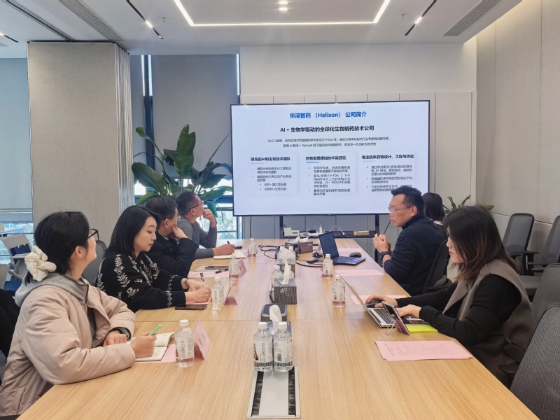 华深智药生物科技(苏州)有限公司总经理田亮,行政经理夏玮,实验室管理马瑛博参与座谈。田亮介绍了公司以“AI+生物学”为核心的创新药研发核心业务,表达了企业对医学、药学人才的迫切需求,愿为学生提供实习实践与就业成长的优质平台。