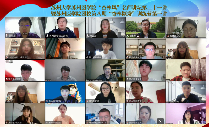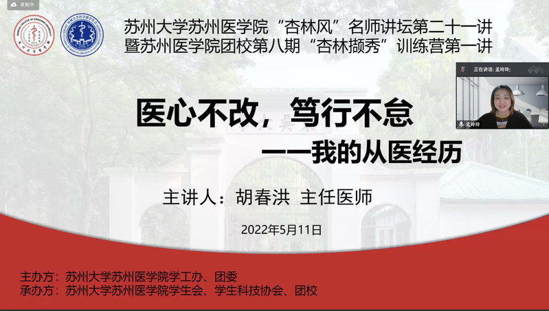 5月11日晚,苏州大学苏州医学院“杏林风”名师讲坛第二十一讲暨团校第八期“杏林撷秀”训练营第一讲在腾讯会议顺利举办。苏州大学第一临床医学院副院长胡春洪教授担任主讲人,以《医心不改,笃行不怠——我的从医经历》为题给学院师生带来了一场精彩的讲座。苏州大学苏州医学院党工委副书记、副院长孟玲玲老师,医学影像系教研室副主任胡粟老师,医学影像系副研究员陈慧勤老师,医学院团委书记王昌伟老师,应邀出席,部分辅导员代表和385名医学生参加了本次讲座。会议由王昌伟老师主持。