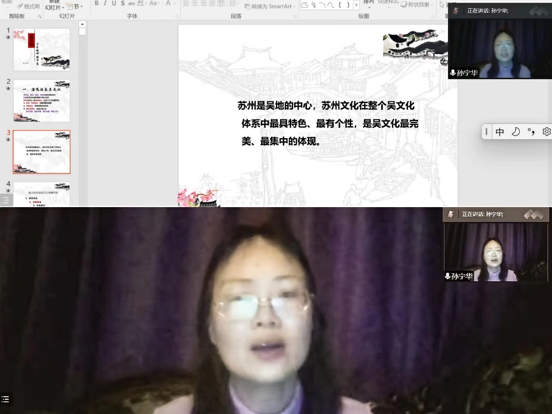 主持人医学院副院长钟慧老师首先介绍了讲座的主要目的,即为了帮助同学们排解疫情在家的焦虑感,开阔心胸增长见识,同时希望传播吴文化,培育校园文化氛围。