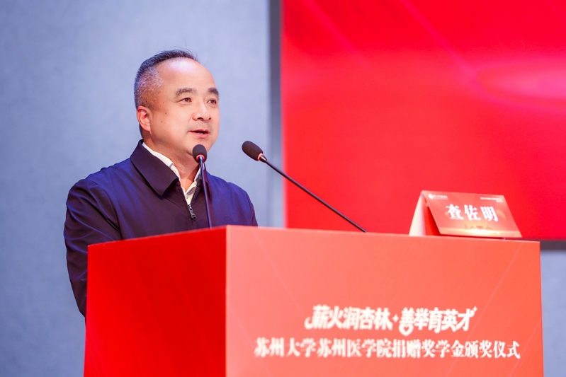 苏州大学党委常委、副校长查佐明致辞,查校长对唐仲英医学大楼报告厅首次正式投入使用表示欣喜,高度肯定了苏州医学院近年来依托“名城名校”融合发展战略取得的办学成果。他指出,捐赠单位的善举不仅为学院发展注入强劲动力,更在青年学子心中播撒下敬畏生命、仁心仁术的种子。同时,他对全体医学生提出四点希望:心怀感恩、志存高远,精进不休、追求卓越,修身立德、仁心仁术,扎根苏州、反哺社会,勉励同学们将个人理想融入健康中国建设,薪火代代相传。