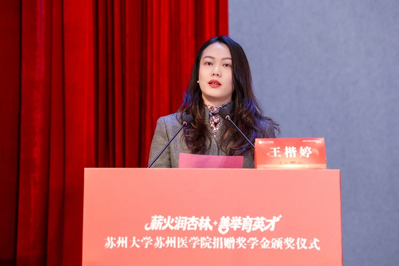 齐鲁制药江苏分公司副总经理王楷婷作为捐赠单位代表发言,她表示校企合作是双向奔赴的美好旅程,企业将持续践行社会责任,助力医学教育发展,期待与苏州医学院携手共育医学良才。