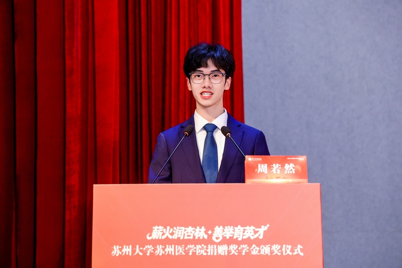 苏州大学苏州医学院2023级临床医学专业周若然作为获奖学生代表发言,他表示奖学金是求学路上的灯塔,既凝聚着社会的关爱与期望,更赋予了学子前行的责任与力量,未来将以更扎实的行动践行医者初心,不负韶华、不负期许。
