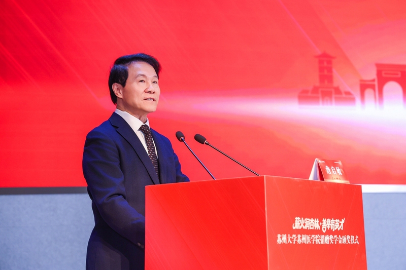 詹启敏院士总结讲话,他回顾了苏州医学院自1912年创办以来的114年发展征程,肯定了学院在人才培养、科研攻关、社会服务等方面的丰硕成果。他指出,医学教育是守护人民生命健康的重要基石,各捐赠单位的善举为医学人才培养注入了温暖与力量,架起了社会与高校、企业与学子之间的桥梁。面对我国卫生健康事业高质量发展的新机遇,他勉励获奖学子以此次获奖为新起点,坚定医学信念,深耕专业领域,努力成长为堪当民族复兴大任的新时代医学人才,为生命健康事业贡献青春力量。他表示,即将迎来114周年生日的苏州医学院,将站在新的历史起点上,坚守办学初心,深耕医学教育,推动各项事业高质量发展,努力跻身国内医学院校一流方阵。