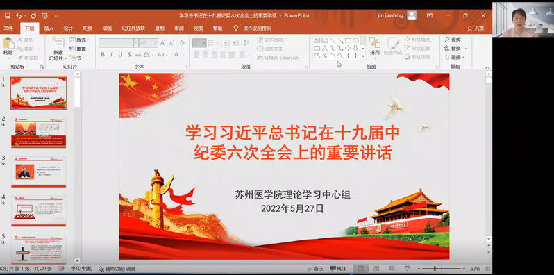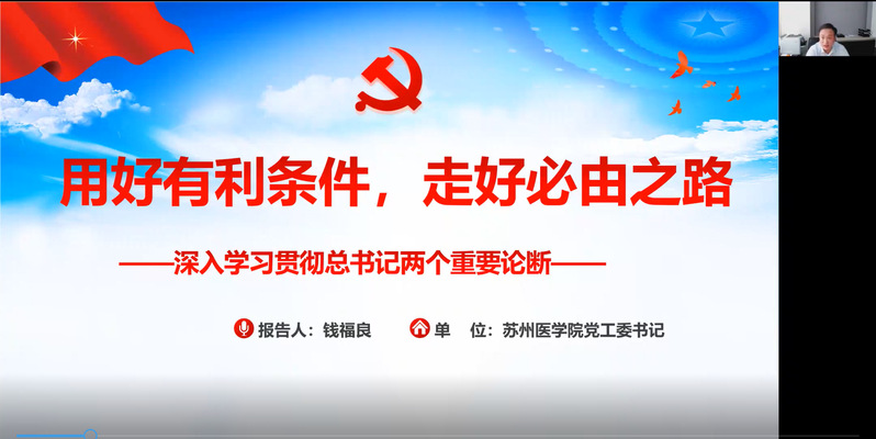 为深入学习习近平总书记在十九届中央纪委六次全会上发表的重要讲话精神,5月27日下午,医学院党工委通过视频会议方式召开理论学习中心组集中学习会议。党工委书记钱福良作题为“用好有利条件,走好必由之路——深入学习贯彻习近平总书记两个重要论断”的学习报告,纪工委书记李伟文领学学习习近平总书记在十九届中央纪委六次全会上发表的重要讲话精神,生物医学研究院副院长陈军作重点发言。理论学习中心组全体成员参会,会议由党工委书记钱福良主持。