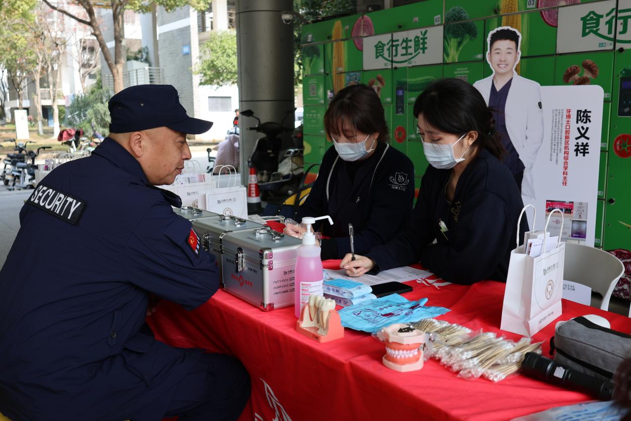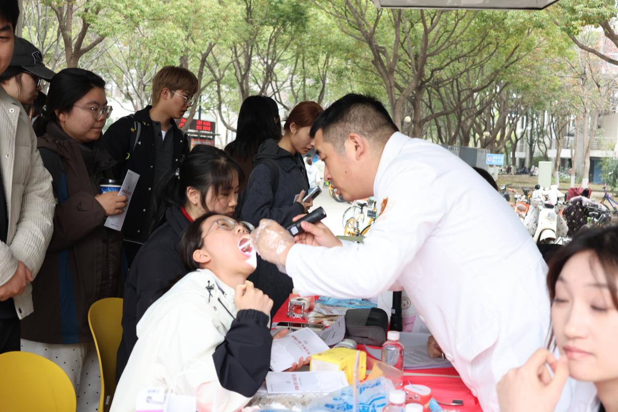 活动现场,支部党员佩戴党员徽章亮身份、树形象、作表率,与牙博士医护团队、学生志愿者分工协作、密切配合,让义诊服务有序高效开展。在免费口腔检查区,专业医师借助口镜、探针等器械,为师生细致排查龋齿、牙龈炎、智齿异常等常见口腔问题,逐一给出个性化诊疗建议和日常护理指导;一对一咨询专区里,党员专家与医护人员耐心解答师生关于智齿拔除、牙齿矫正、洗牙美白等问题,针对“奶茶控”“熬夜党”的生活习惯,科普专属口腔自救技巧,破除口腔护理误区;科普宣传区通过展板展示、宣传单页发放等形式,向师生普及牙科问题诊断、饮食健康等护齿知识,志愿者们热情引导、贴心服务,成为现场一道亮丽的风景线。参与活动的师生还能获赠定制牙刷、牙线、牙膏等护齿礼品,让大家在收获口腔健康知识的同时,感受到实实在在的关怀。