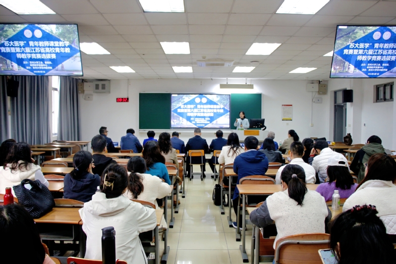 为践行“以赛促教、以赛促改、以赛促建”理念,切实提升医学院青年教师课堂教学质量与立德树人能力,4月1日,“苏大医学”青年教师课堂教学竞赛暨第六届江苏省高校青年教师教学竞赛(医学组)选拔赛在苏州大学独墅湖校区一期302幢2407室举办。本次比赛由苏州大学工会、教务处、教师教学发展中心主办,苏州医学院承办,也是医学院层面首次举办青年教师教学竞赛。苏州大学工会主席顾志勇、苏州大学苏州医学院执行院长李斌、副院长钟慧、苏州医学院党委副书记吴德建出席活动。苏州大学本科教学督导委员会主任委员龚政、上海交通大学医学院附属瑞金医院普外科副主任医师叶枫、原苏州医学院基础医学院病理学与病理生理学系副教授邓敏、苏州大学附属儿童医院重症医学科主任柏振江、苏州大学苏州医学院公共卫生学院副教授武婧受邀担任评委,共同见证十二位青年教师同台竞技、展示教学风采。活动由苏州大学苏州医学院院长助理常杰主持。