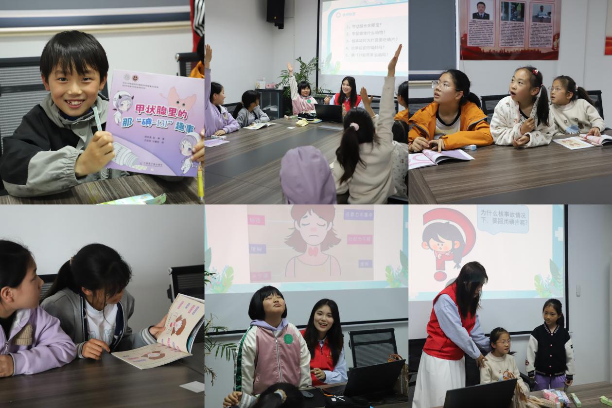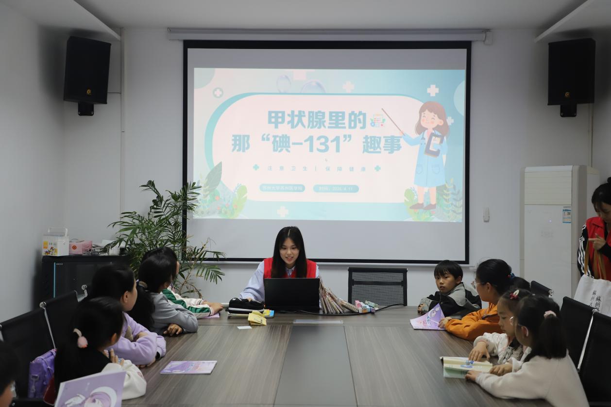 为提升儿童青少年对核应急知识的了解,增强自身健康防护意识,2026年4月11日,苏州大学苏州医学院医研先锋团的志愿者们走进苏州市吴江区震泽镇朱家浜村,为暖“新”伙伴关爱计划公益托管班的同学们带来了一堂主题为“甲状腺与碘-131”的趣味科普课。本次活动通过漫画阅读、多媒体教学与互动问答相结合的方式,将专业的医学知识转化为孩子们可感知、可理解的实用内容,促进乡村儿童科学素养提升。