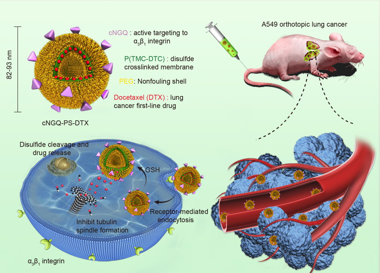 在最新研究中,钟志远教授团队设计了一种环形多肽cNGQ介导的多西他塞聚合物囊泡药物(cNGQ-PS-DTX,图1),其粒径较小(93nm),表面电位为中性,生理环境下稳定性好,在细胞内还原环境下触发DTX快速释放。细胞实验结果显示该囊泡药物在α3β1整合素过表达的A549细胞中展现出优异的体外抗肿瘤活性,显著高于无靶向组(PS-DTX)及自由药物对照组。重要的是,cNGQ-PS-DTX体内最大耐受量为自由药物的8倍以上,体现出优异的安全性。由于稳定的交联结构及特异性靶向修饰,囊泡药物体内循环时间大大延长,在肿瘤组织积累量显著提高。在荷原位肺癌小鼠模型中,表现出优异的肿瘤抑制效果,能有效延长小鼠生存时间,且无明显毒副作用。