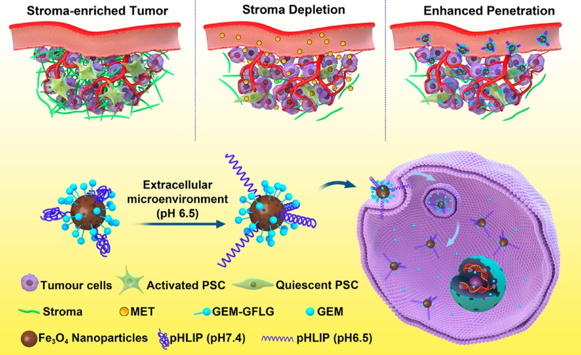 胰腺癌号称“癌中之王”,是预后最差的实体肿瘤,5年生成率不到5%。因为被激活的胰腺星状细胞会分泌大量的细胞外基质,使胰腺肿瘤成为细胞外间质最致密的实体瘤。因此,向胰腺癌肿瘤内部递送药物异常困难,使化疗效果变得极差。针对这一问题,上述研究团队创新地提出,联合二甲双胍实现靶向递送胰腺癌化疗药物吉西他滨的新策略。