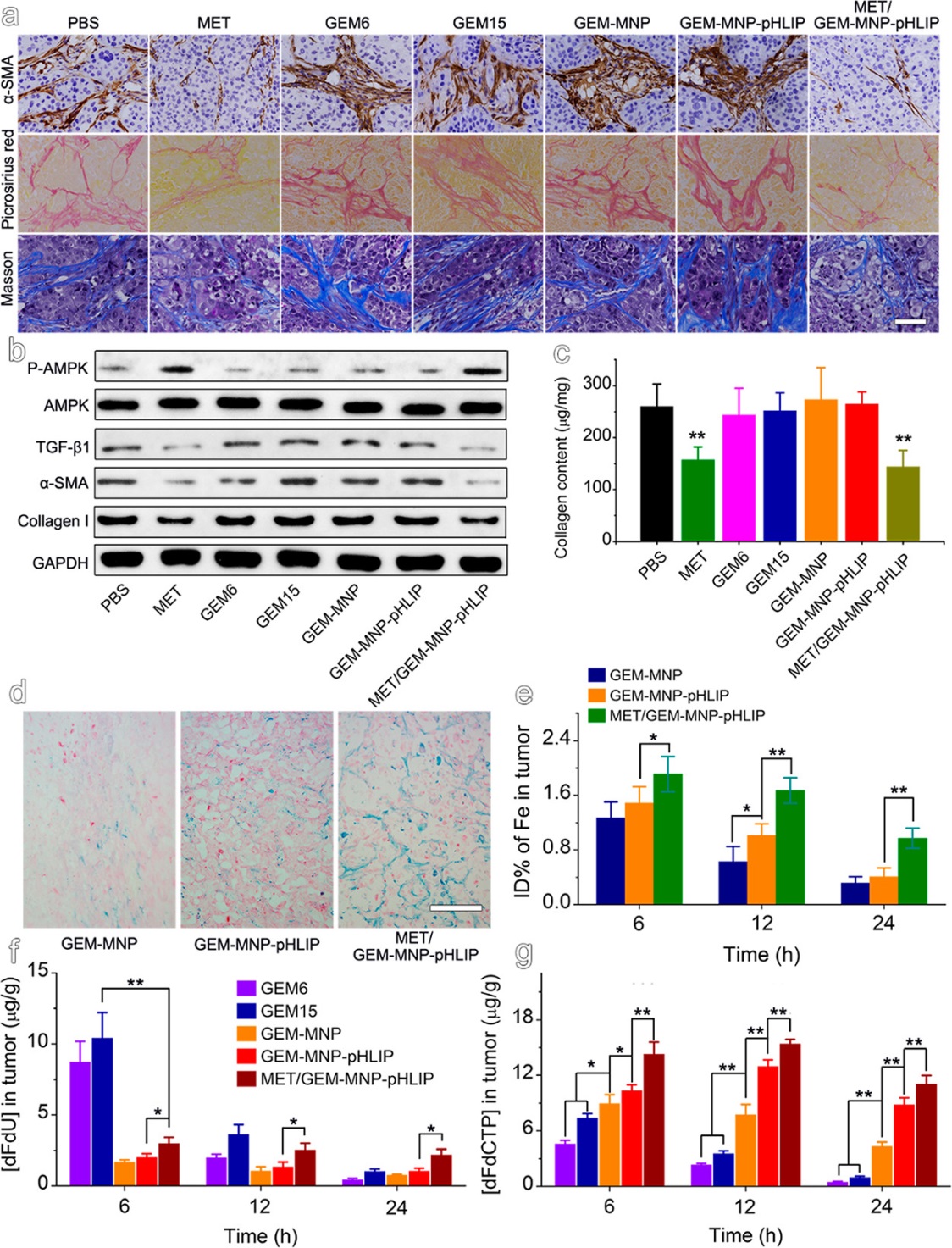 利用上述发现,他们提出了通过二甲双胍和吉西他滨先后给药,以改善胰腺癌化疗药物吉西他滨的递送效率的策略。同时,为了证实这一策略的有效性,他们围绕吉西他滨设计合成了一个先进的可视化靶向药物递送系统。在这个系统中,他们采用磁性纳米颗粒作为吉西他滨的载体,也利用其磁共振成像对比度增强功能,来可视化监控吉西他滨的有效递送。同时,在颗粒表面耦联了pH敏感插入肽(pHLIP),构建了一个智能化的药物递送系统(GEM-MNP-pHLIP)。当其在肿瘤组织中富集后,肿瘤组织的微酸环境会激活pH敏感插入肽pHLIP的肿瘤细胞靶向能力,实现GEM-MNP-pHLIP的肿瘤细胞靶向内吞,进而抑制胰腺癌细胞的增殖。