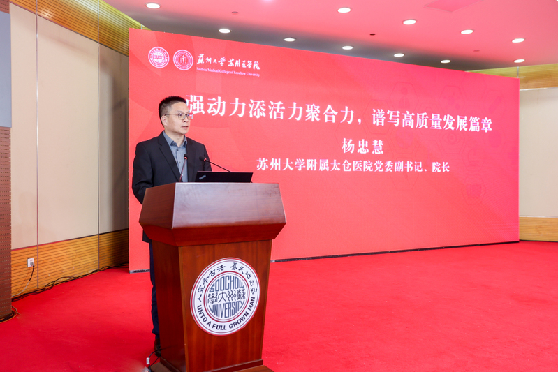 苏州大学附属太仓医院党委副书记、院长杨忠慧以《强动力添活力聚合力,谱写高质量发展篇章》为题进行交流发言,介绍了太仓市的情况,医院概况,高质量发展路径以及对当前发展的思考和展望。