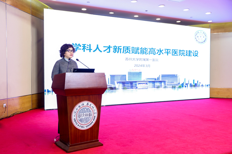 苏州大学附属第一医院党委副书记、院长缪丽燕以《学科人才新质赋能高水平医院建设》为题作交流发言,从医院运行概况、人才概况、学科建设、国际化建设、发展规划、医学院支持六大方面介绍了医院近一年的发展概况。