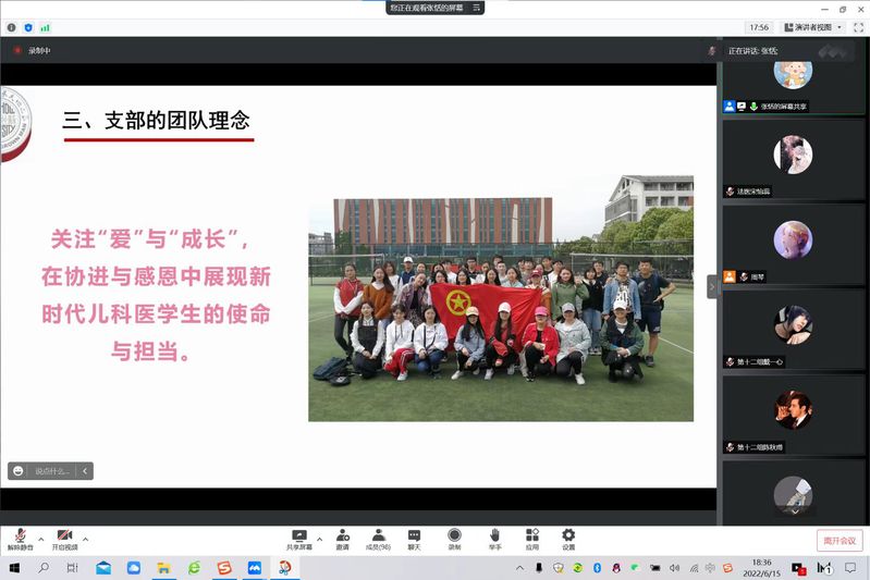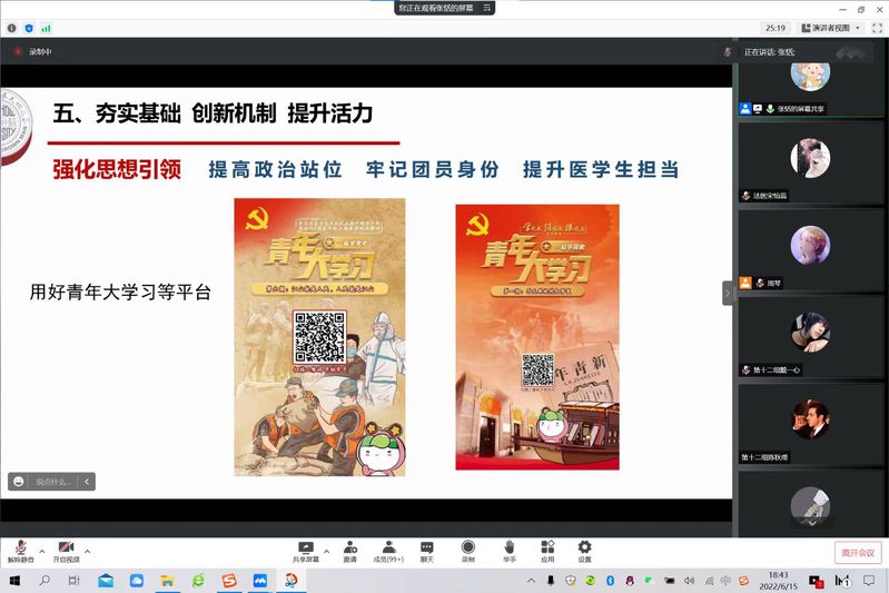 6月15日,第八期杏林撷秀训练营班团建设专题讲座于线上进行。全国五四红旗团支部——2017级临床儿科团支部团支书、江苏省优秀毕业生张恬同学围绕自己大学五年的团支书生涯做了经验分享。