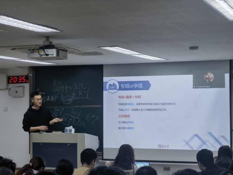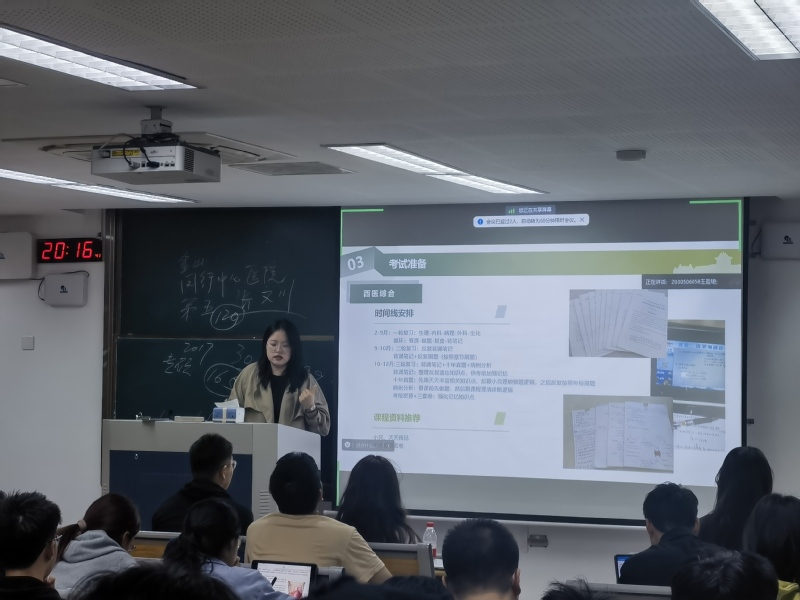 4月11日晚上,“让青春在奋斗中闪闪发光”临床医学专业本科生升学经验交流会在天赐庄校区博远楼201多媒体教室顺利开展。医学博士、启航考研医学考研辅导团队首席讲师侯洋,南京大学外科学准硕士研究生巢悦、苏州大学附属第一医院血液科准硕士研究生顾鹏辰和北京大学第一医院准硕士研究生牛子贺应邀作为主讲嘉宾进行宣讲。2020、2021级临床医学专业同学参会。交流会由学生会组织、徐嘉婕同学主持。