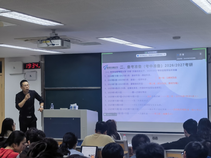 侯洋老师分享了多年考研西医综合实战经验和丰富的教学经验。他以通俗易懂、深入浅出的方式,详细介绍了政治、英语、西医综合、专业英语等科目的复习策略,以及复试准备的阶段性复习计划和方法。侯老师的幽默风趣让学生们在轻松愉快的氛围中对临床医学专业考研有了更加清晰的认识。