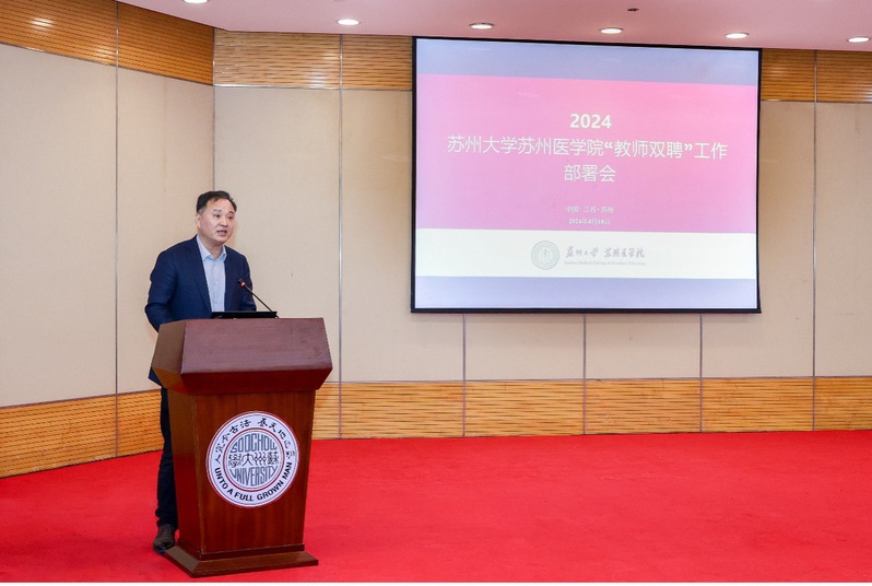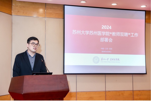 为做好苏州医学院教师双聘工作,推动临床与基础融合、学科交叉、科技创新与人才培养,苏州医学院于4月18日上午召开教师双聘工作部署会。苏州大学科技党委书记徐小乐、苏州大学人才工作办公室副主任兼人力资源处副处长尹奎及学校人事、科研部门相关科室主任,中国工程院院士、苏州医学院院长詹启敏,执行院长李斌及相关领导班子成员,苏州医学院各学院、科研机构、附属医院主要负责人、分管科研工作领导及人事秘书,各附属医院人事部门负责人,苏州医学院各办公室主任及副主任参加会议。会议由苏州医学院党工委书记钱福良主持。