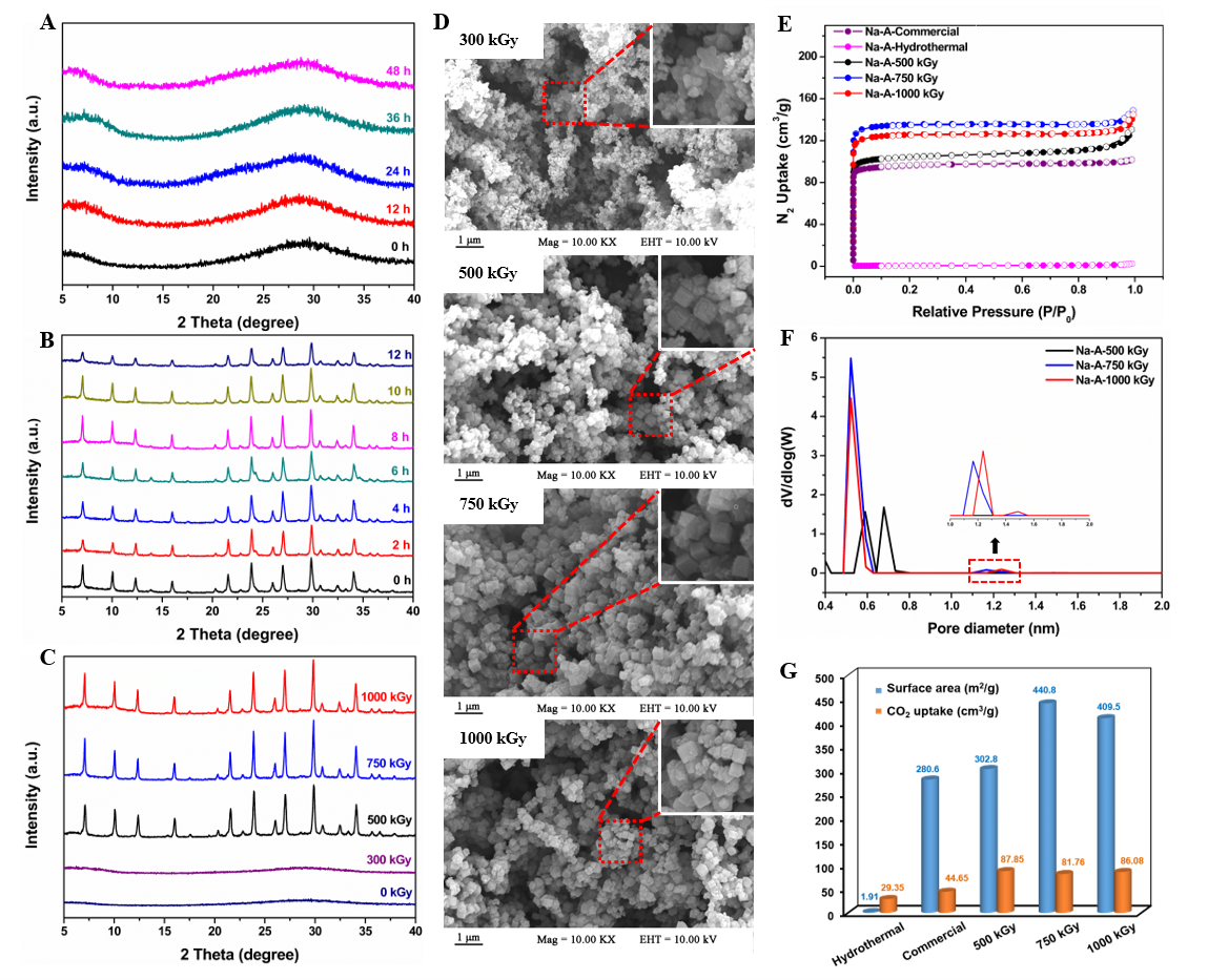 静态水吸附测试表明,Na-A-1000 kGy样品达到HG/T 2524-2010国家优等品标准,证明其具有良好的商业化前景。此外,二氧化碳吸附测试表明,辐射法所制备的沸石样品的吸附性能显著提升,其中Na-A-500kGy的吸附量达到87.85 cm3/g,是实验室水热合成的和商业沸石的2 - 3倍。