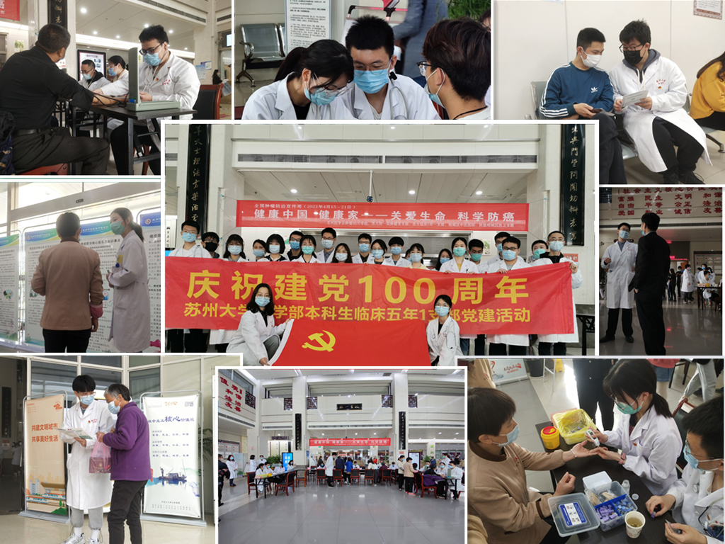 2021年4月15日-21日是第27个全国肿瘤防治宣传周,为发挥党员先锋模范作用、为“健康中国”助力,为中国共产党成立100周年献礼,2021年4月17日,苏州大学医学部本科生临床五年1支部联合苏州市医学会肿瘤MDT学组、苏州大学附属第一医院肿瘤党支部、苏州相城区中医医院联合开展了“关爱生命、科学防癌”肿瘤周党建交流活动。本次活动地点为苏州市相城中医院,在医院内,学生党员们耐心为就诊患者发放并解读肿瘤知识宣传册、为患者及其家属测量血压、血糖,同时做好科普宣教,同志们热情的服务与专业的讲解得到了群众的高度认可。