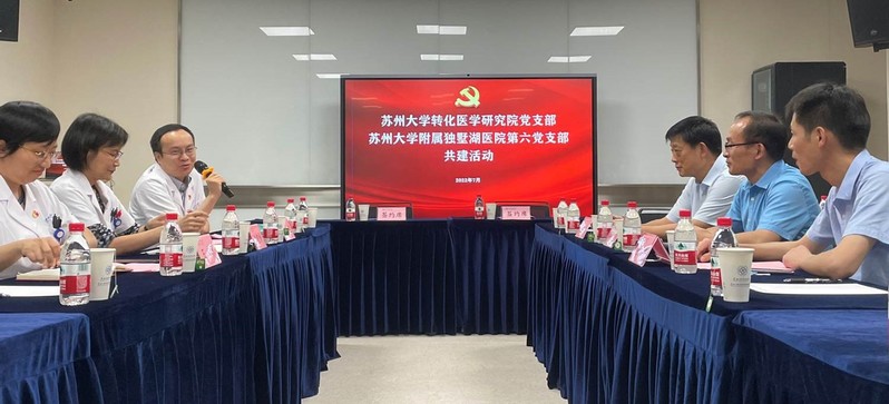 2022年7月20日,为深入学习贯彻习近平新时代中国特色社会主义思想,进一步加强基层党支部建设,推动党建与业务融合,实现基础研究和临床转化优势互补、有效提升科研水平和人才培养质量,苏州大学转化医学研究院党支部与苏州大学附属独墅湖医院第六党支部举行共建签约仪式。苏州大学附属独墅湖医院党委副书记、纪委书记洪建娣、苏州大学苏州医学院党工委副书记吴德建、欧洲科学院院士、苏州大学转化医学研究院院长时玉舫、苏州大学转化医学研究院副院长、党支部书记陈永井、独墅湖医院临检中心主任、第六党支部书记王琳及双方支部党员代表参加了此次活动,仪式由苏州大学附属独墅湖医院党政办主任傅强主持。