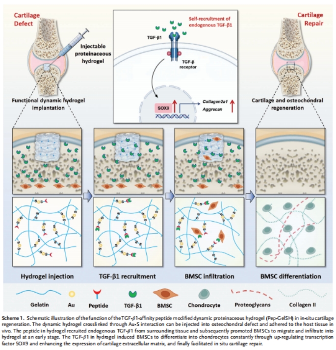 文章题目:Dynamic Proteinaceous Hydrogel Enables In-Situ Recruitment of Endogenous TGF-β1 and Stem Cells for Cartilage Regeneration