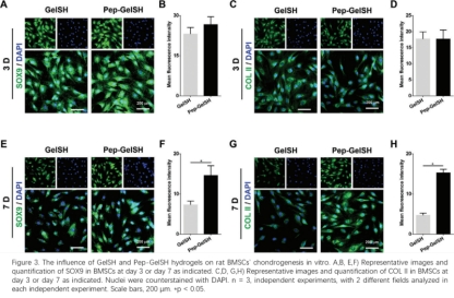 相较于无TGF-β1靶向肽修饰的动态水凝胶GelSH,Pep-GelSH在体外可显著提高对TGF-β1的募集/亲和作用。Pep-GelSH中较高水平的TGF-β1一方面可以在早期(6 h)促进BM-MSC的迁移,另一方面可以通过上调SOX9和II型胶原的表达,达到促进BM-MSC向软骨细胞分化的效果(图2-3)。