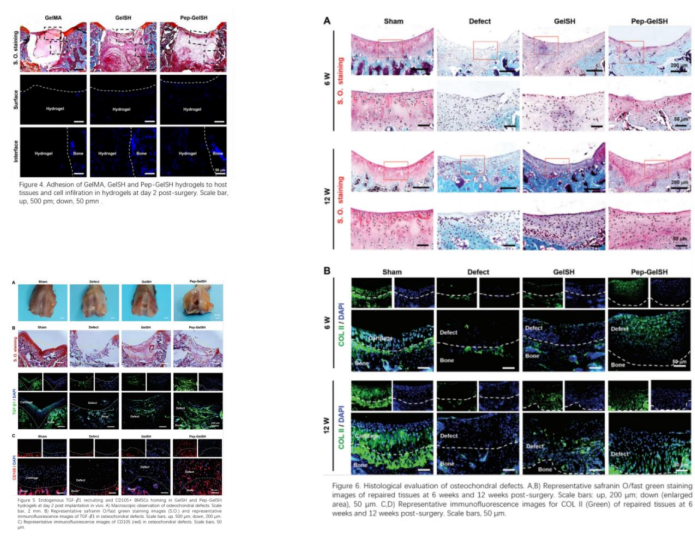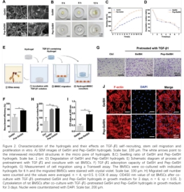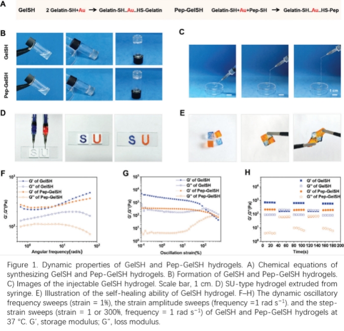 在本研究中,通过Au诱导的巯基明胶和巯基TGF-β1靶向肽的交联制备了动态蛋白质水凝胶(Pep-GelSH)。由于Au-S配位的可逆性,该水凝胶不仅表现出多孔结构和对细胞生长的高生物相容性,而且还具有可注射和自修复的特性,具有微创植入、易于操作的优点(图1-2)。