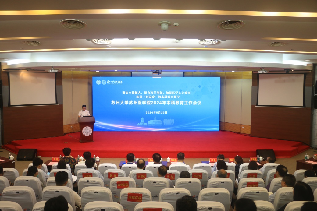 为进一步深化本科教育教学改革,全面提高人才培养质量,打造更有温度的本科教育,5月23日下午,苏州大学苏州医学院2024年本科教育工作会议在独墅湖校区炳麟图书馆学术报告厅召开。苏州大学教务处处长方亮,中国工程院院士、苏州医学院院长詹启敏,医学院全体领导班子成员、各办公室、中心负责人,医学院各学院、承担本科教学任务的附属医院党政负责人和分管领导,科研机构主要负责人,本科教学督导,各学院、临床学院教研室主任、教师代表、临床教学办公室主任、教务秘书参加会议。会议由苏州医学院执行院长李斌主持。