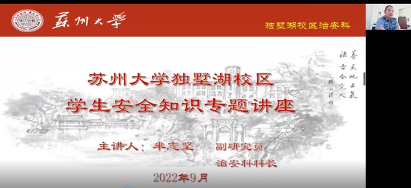 接着,保卫处独墅湖校区治安科科长芈志坚给同学们做了安全知识专题讲座,以发生在校园中的种种案例,深入浅出地阐述了很多安全常识,并强调了国家安全、消防安全、交通安全以及保护自身财产和人身安全的重要性。