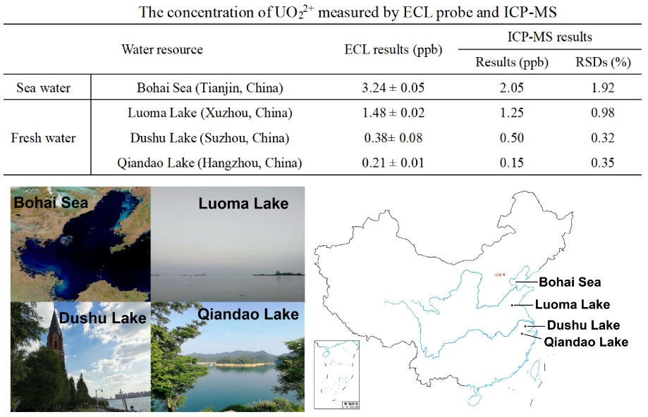为证明该便携式痕量UO22+ ECL监测技术的实际应用价值,该方法分别被用来检测来自渤海(天津)、骆马湖(徐州)、独墅湖(苏州)和千岛湖(杭州)的实际水样中UO22+的含量,其结果与使用ICP-MS法的测定结果非常接近(图2),证明了该技术的实际应用前景。与ICP-MS法相比,ECL检测系统具有成本低、便携式的突出优势,更有利于野外条件下的环境监测工作。该工作为环境中UO22+离子的实时监测和饮用水质量监控提供了有效而精确的手段,也为该领域今后的工作提供了全新的思路。